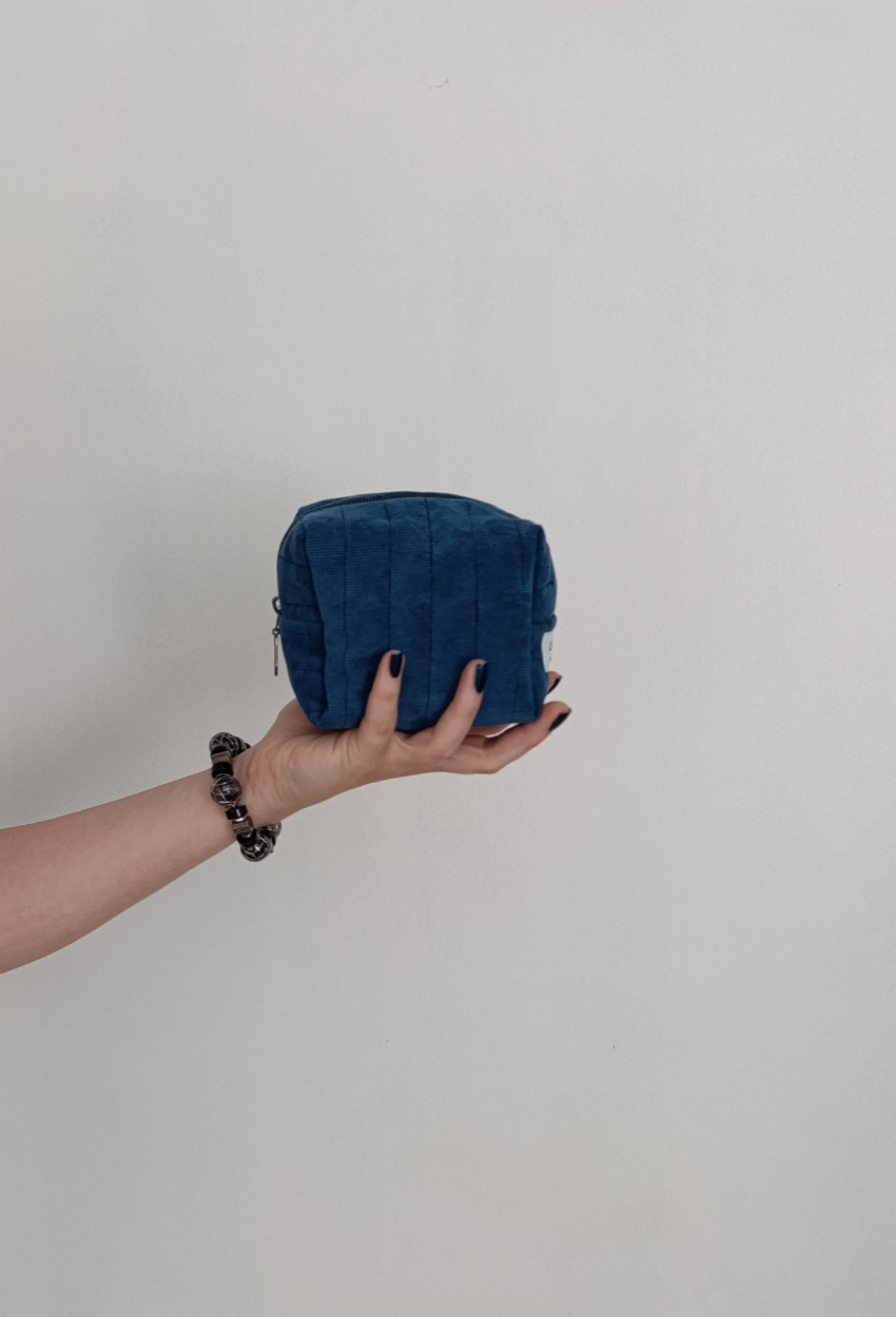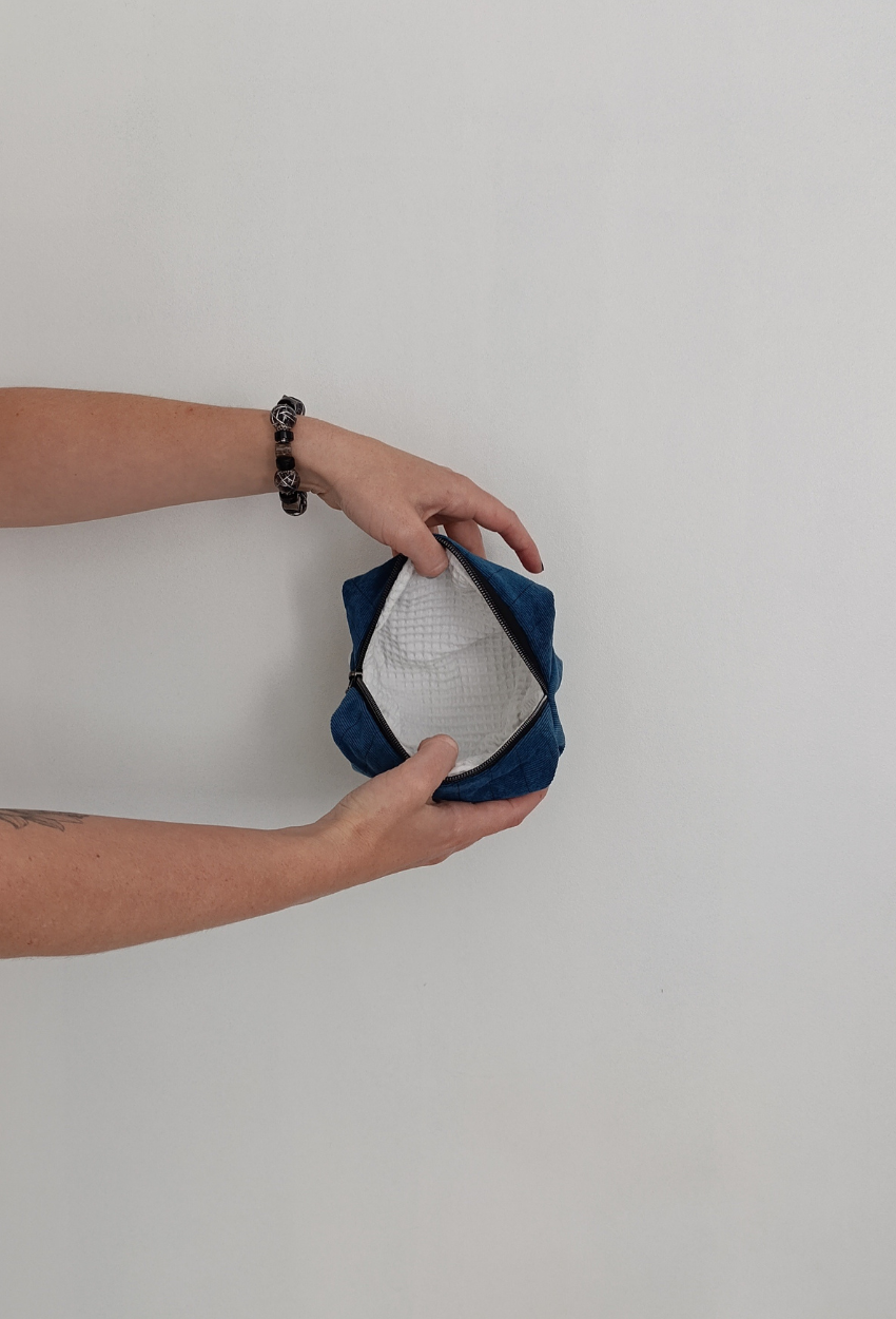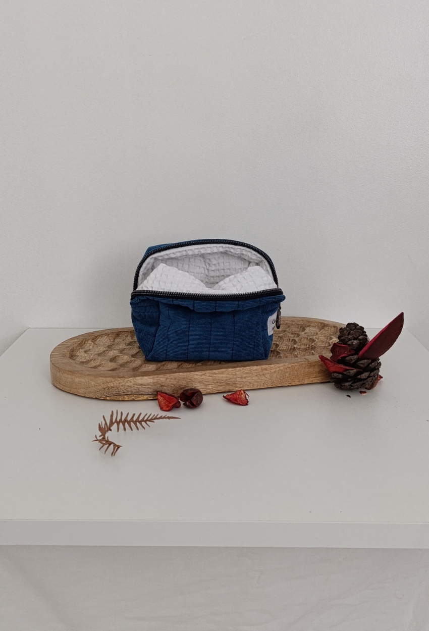 L’extérieur est confectionné en velours côtelé fin bleu pétrole, élégant et intemporel. À l’intérieur, un nid d’abeille blanc, lumineux et texturé, qui apporte contraste et douceur. Toujours cette ouate protectrice, signature de la maison.