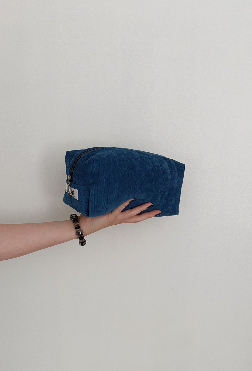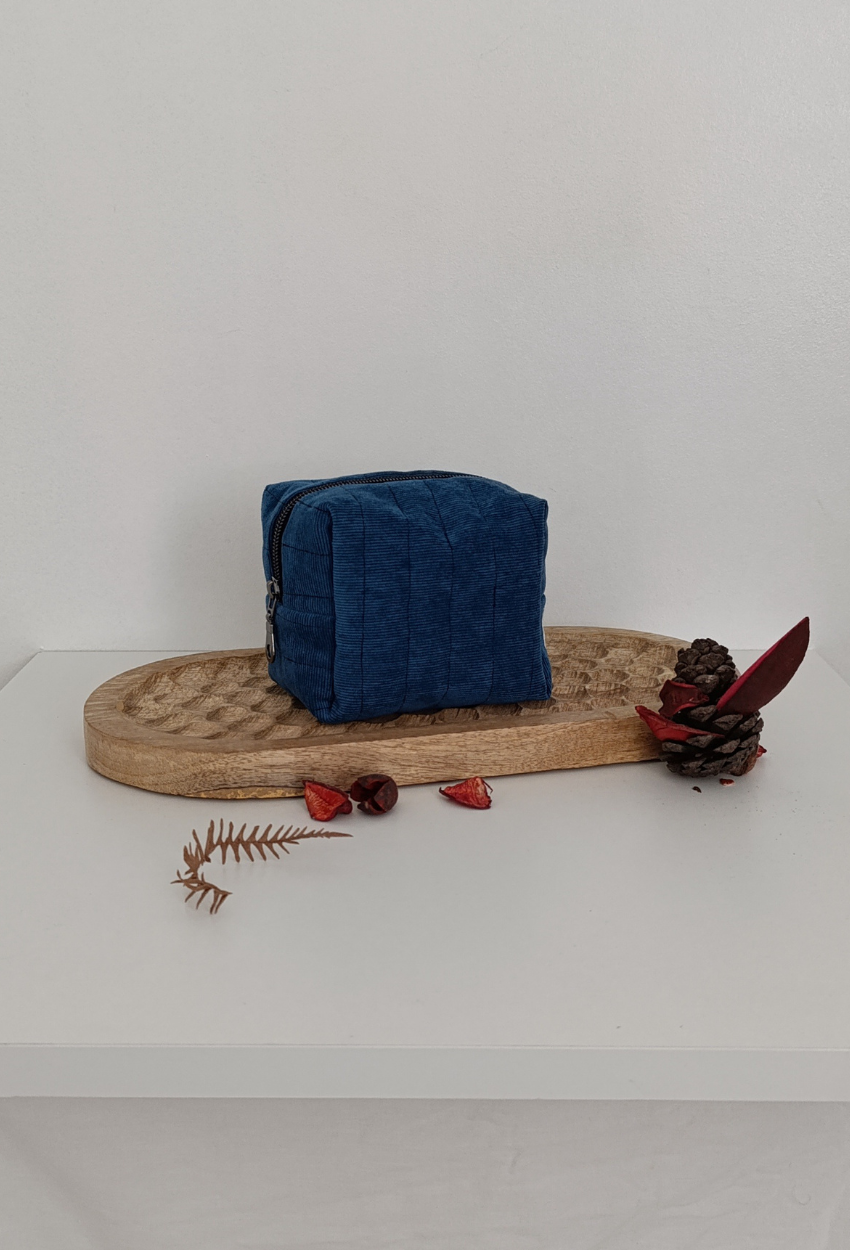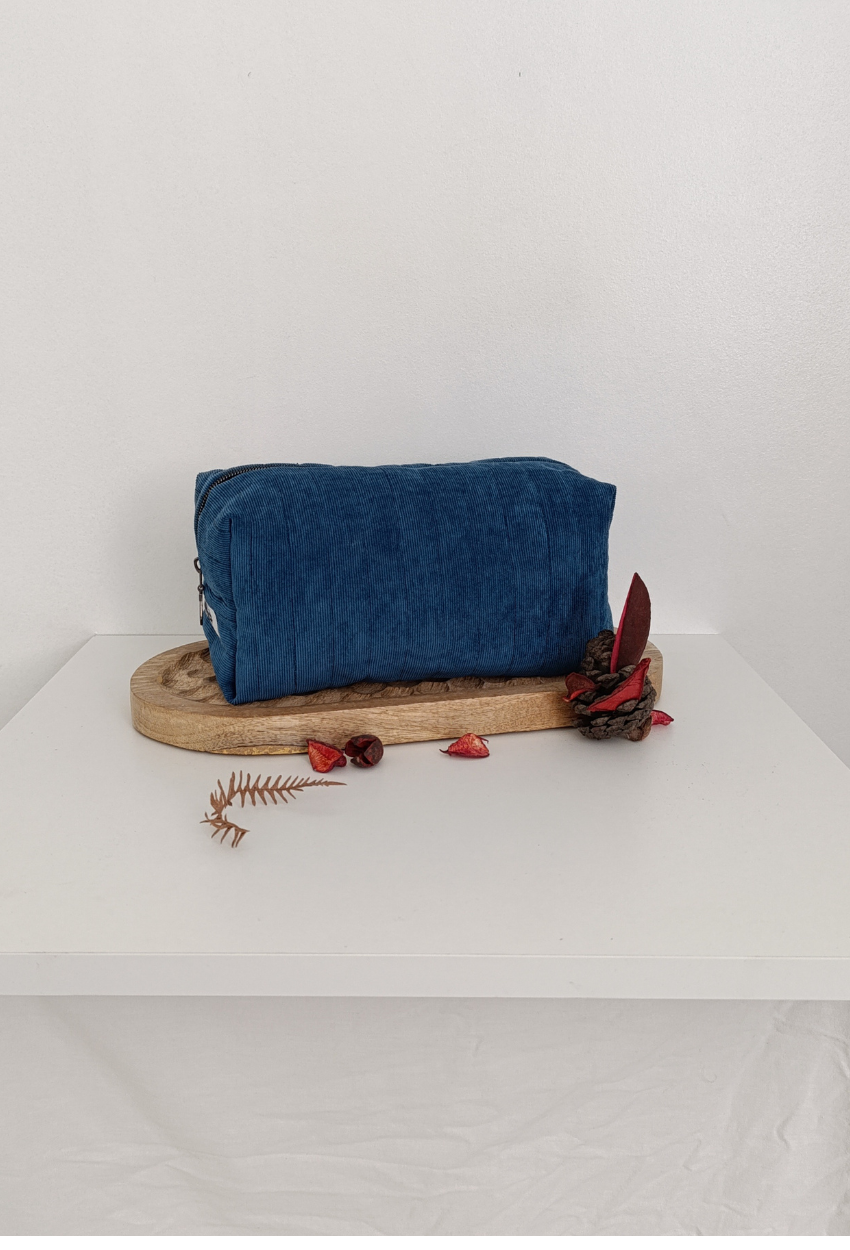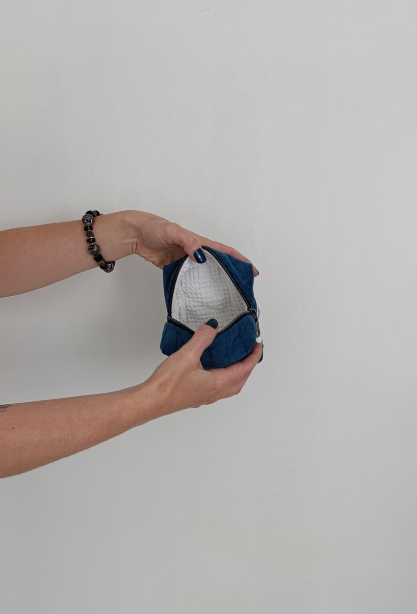 L’extérieur est confectionné en velours côtelé fin bleu pétrole, élégant et intemporel. À l’intérieur, un nid d’abeille blanc, lumineux et texturé, qui apporte contraste et douceur. Toujours cette ouate protectrice, signature de la maison.